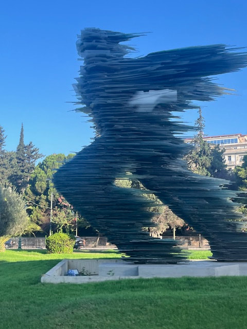A small group of our tour flew from KC to Dulles, then to Frankfurt, then to Athens. This was a long day that put us in Athens too late in the day for roaming around the city. In the evening we joined our fellow travelers for a welcome dinner at a local restaurant. The next day we bus toured Athens and saw the Temple of Zeus, the Parliament building, and the current Olympic Stadium. Then we went to the Acropolis for the climb to see the crown building at the top, the Parthenon that is considered the pinnacle of classical Greek architecture.
