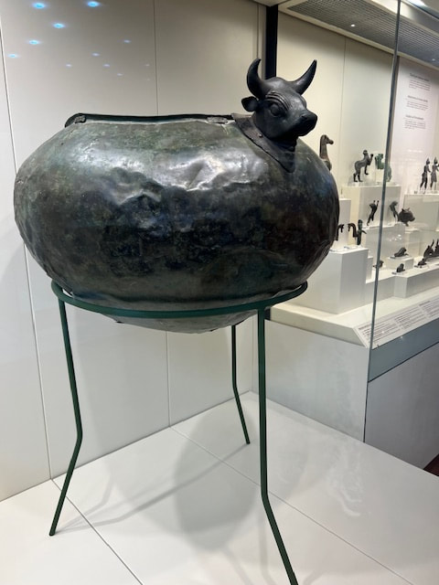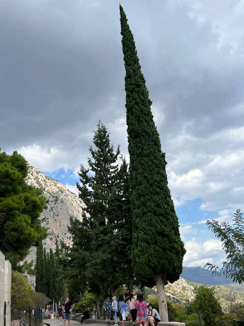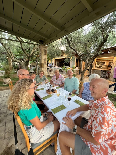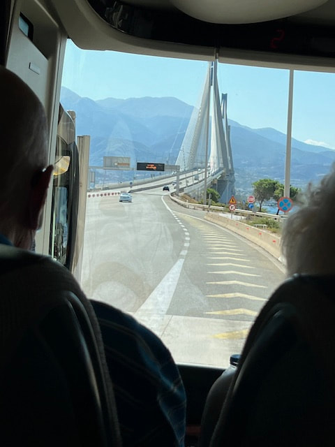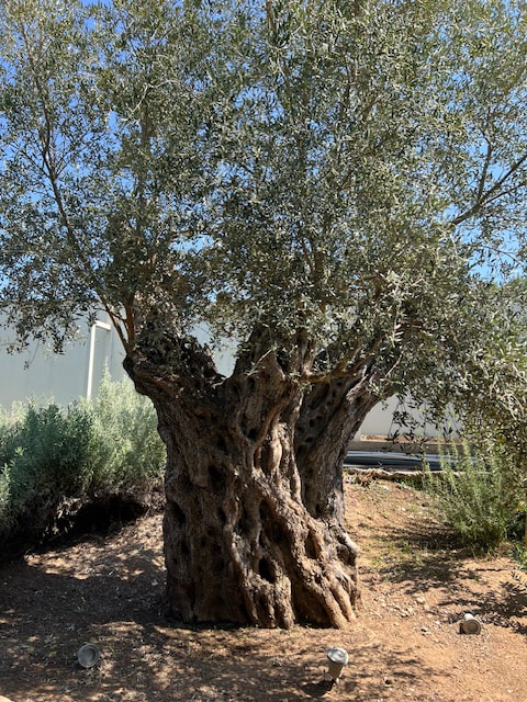 Our next bus tour was along the Gulf of Corinth, crossing into the Peloponnese, the historic city of Olympia, a testament to the grandeur of ancient Greek civilization. We visited a local olive farm in the countryside and met with the owners to learn about everyday life in rural Peloponnese. We learned about processing different olive oils and experienced tasting the varieties. Most of us planned to ship olive oil home, but because of the new tariffs, the owner could not absorb the shipping expense. We marveled at a 600 year old olive tree shown below.