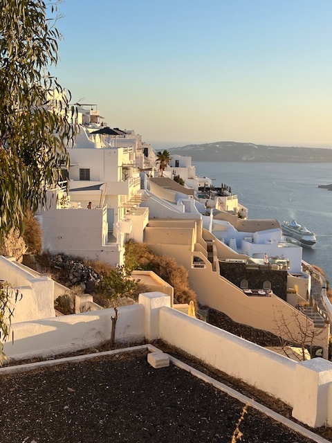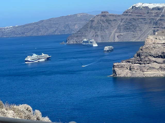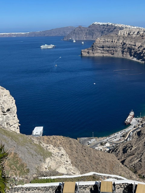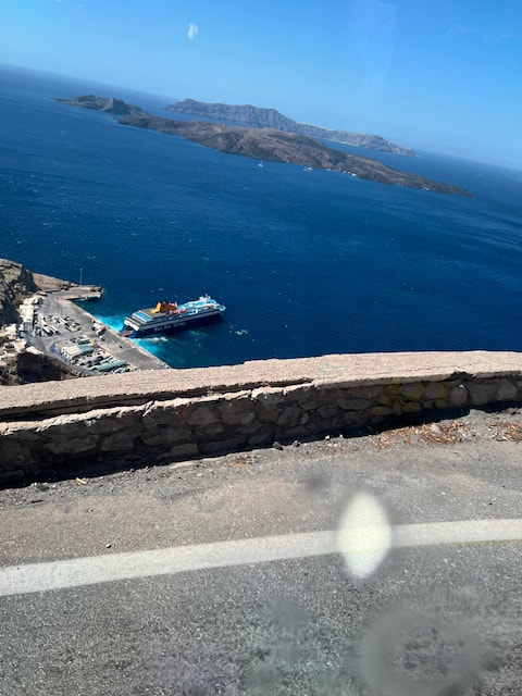 The ferry onslaught was repeated the next day. We cruised from Mykonos to Santorini. We bussed through a fascinating landscape of vineyards, whitewashed chapels, and volcanic cliffs to the spectacular town of Oia, where the best views of the crater were found.